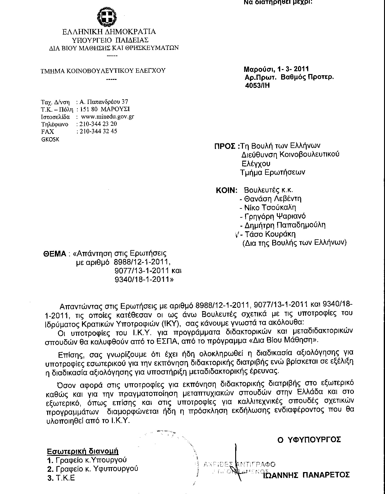 την κ. Υπουργό Παιδείας δια Βίου Εκπαίδευσης και Θρησκευμάτων