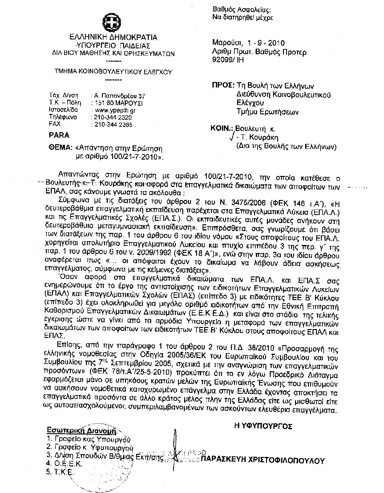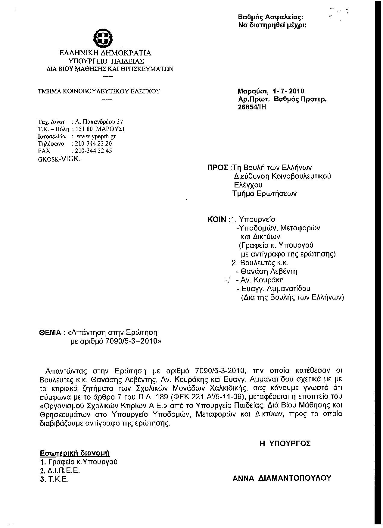 τον Υπουργό Παιδείας και Θρησκευμάτων