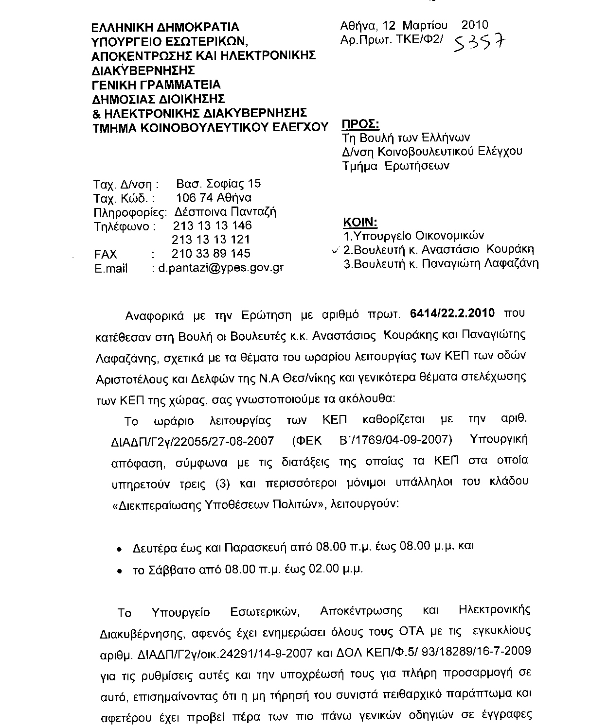 τους κ.κ. Υπουργούς - Εσωτερικών, Αποκέντρωσης και Ηλεκτρονικής Διακυβέρνησης - Οικονομικών