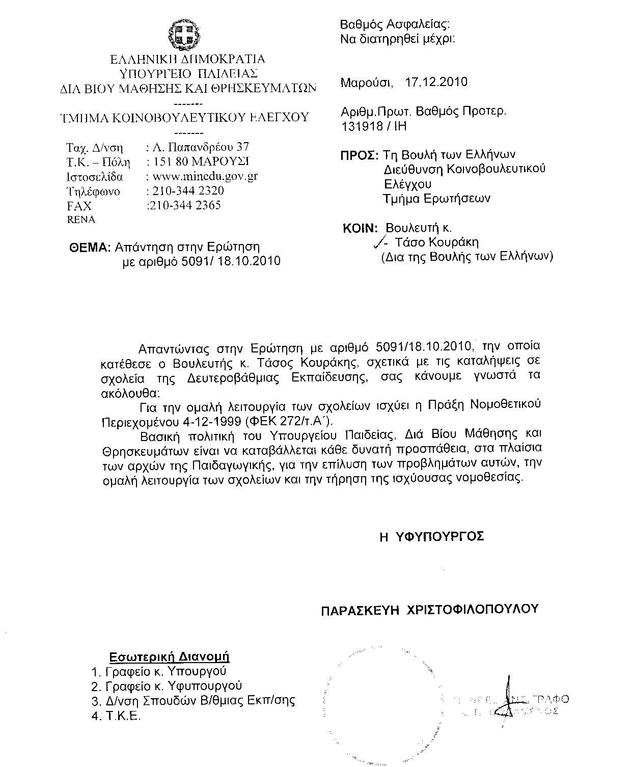 τους κκ. υπουργούς - Παιδείας, Δια βίου Μάθησης και Θρησκευμάτων - Δικαιοσύνης, Διαφάνειας και Ανθρωπίνων Δικαιωμάτων - Προστασίας του Πολίτη