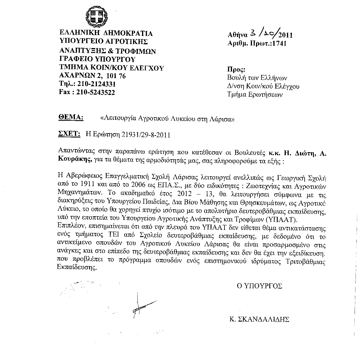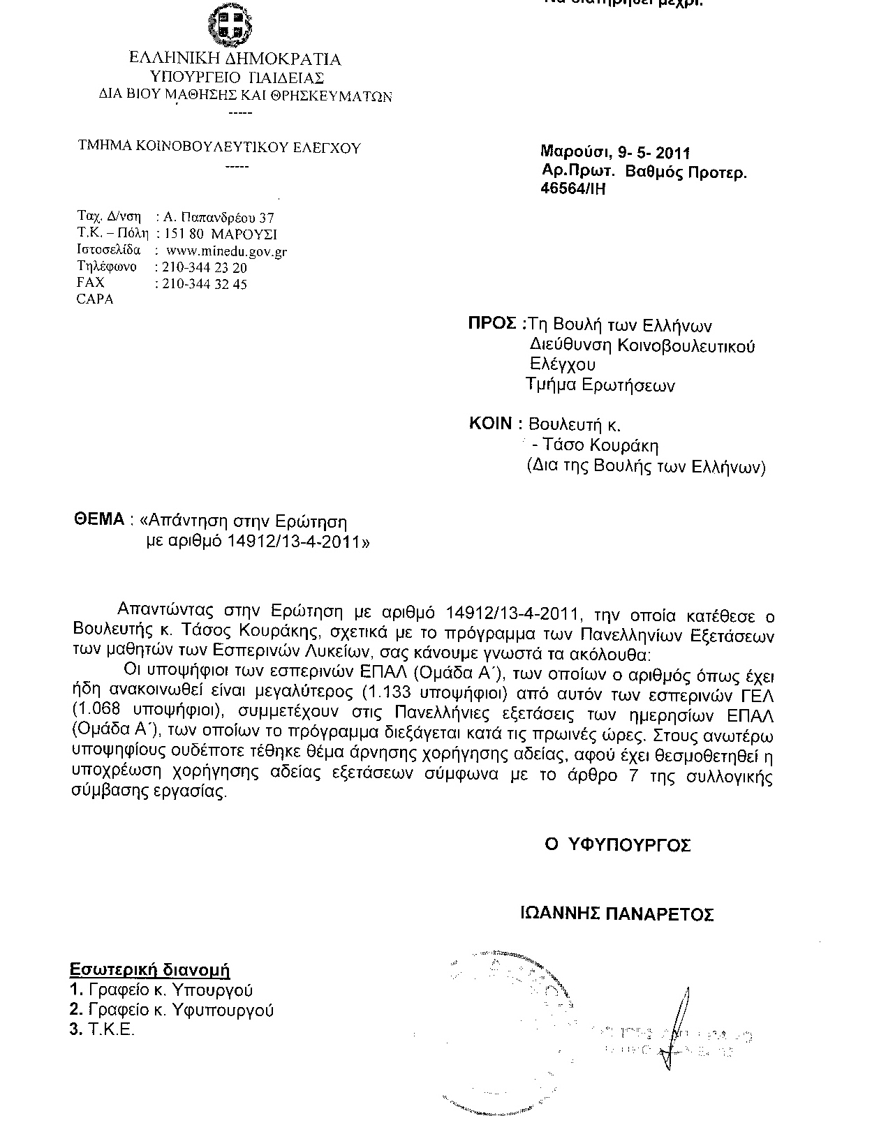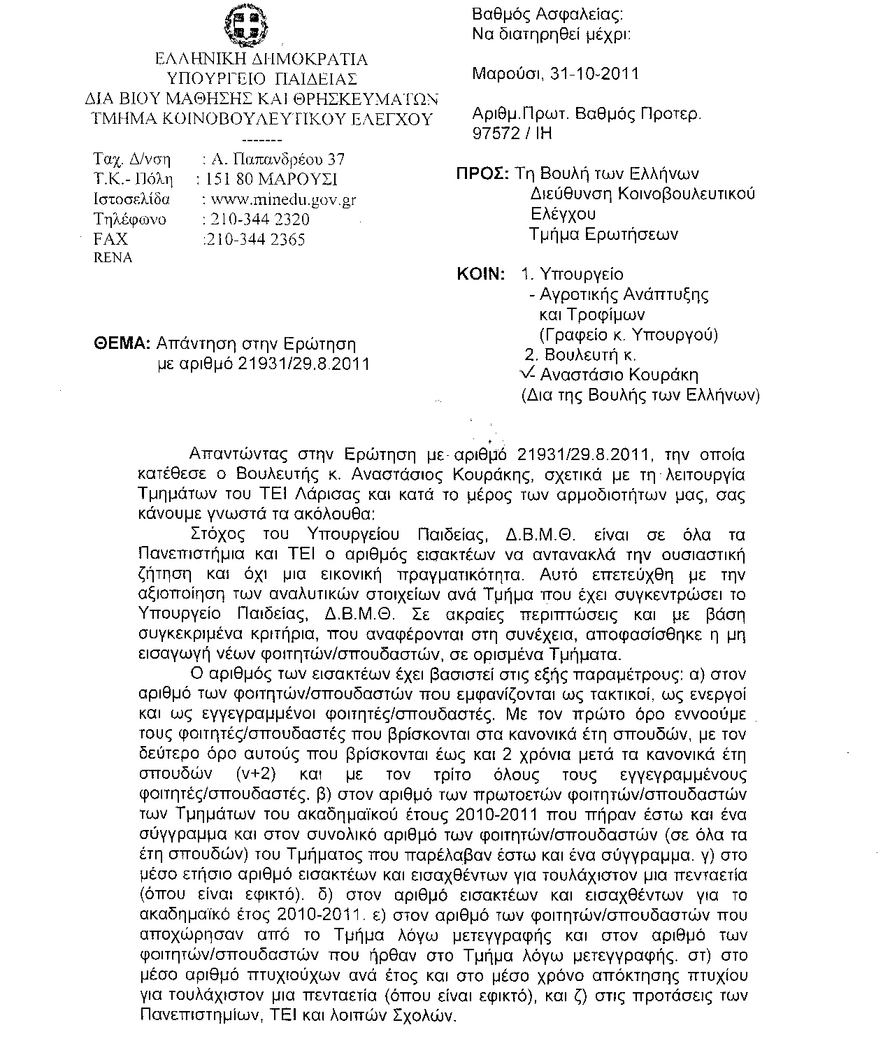 Στον ερωτώντα Βουλευτή κ. Αναστάσιο Κουράκη, θα απαντήσει η Υπουργός Παιδείας, Δια Βίου Μάθησης και Θρησκευμάτων κα Παρασκευή Χριστοφιλοπούλου.