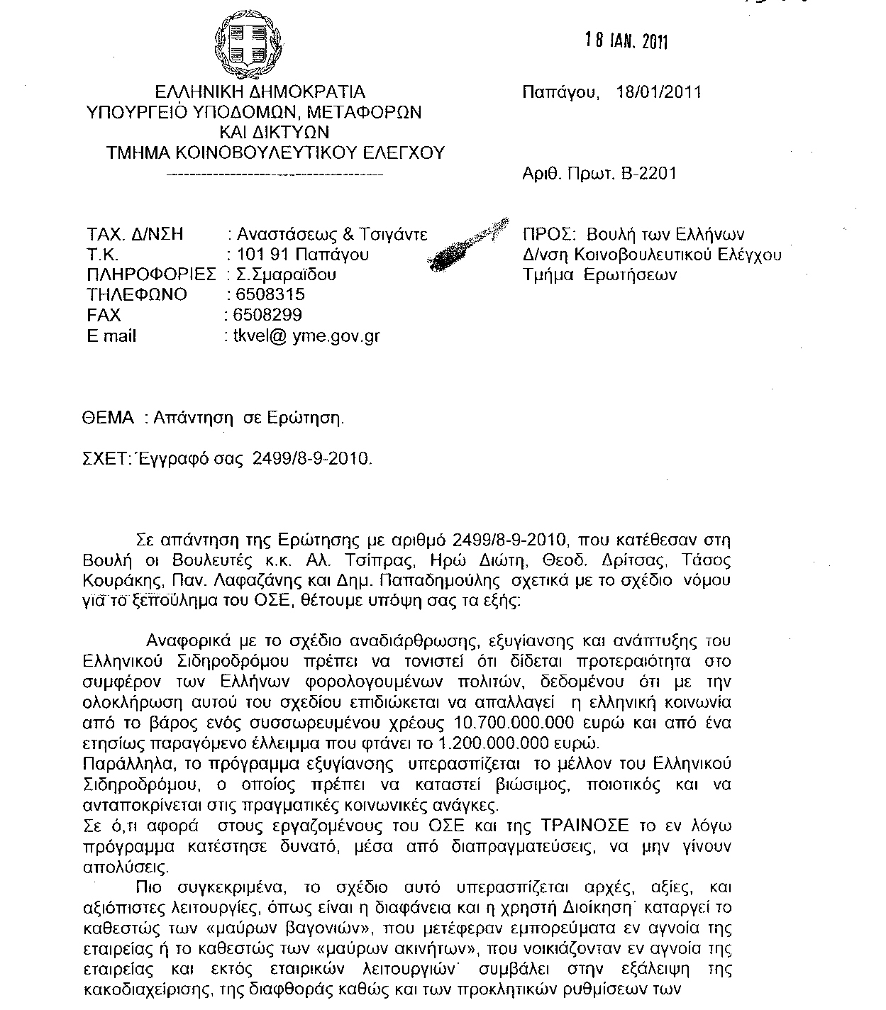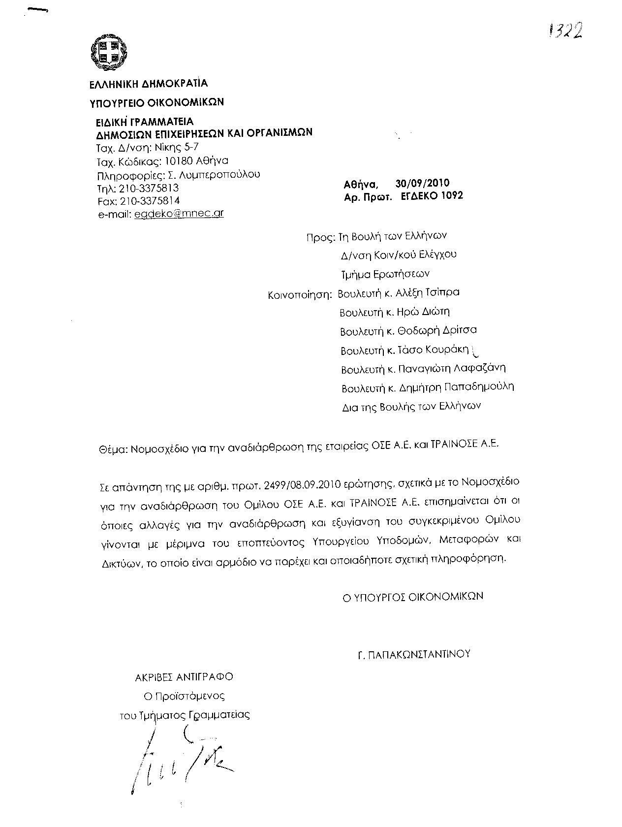 τους κ.κ. Υπουργούς - Οικονομικών -Υποδομών, Μεταφορών και Δικτύων