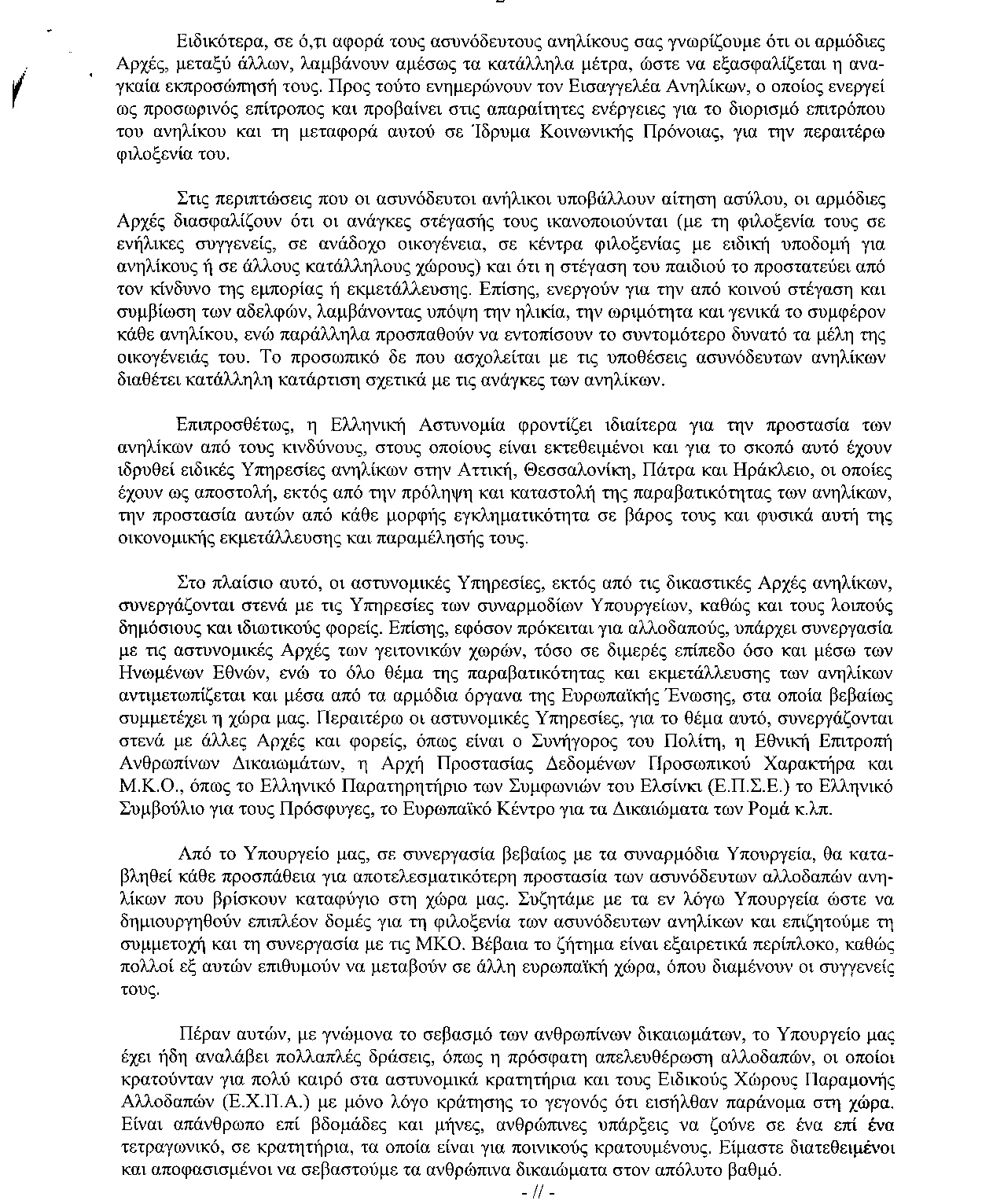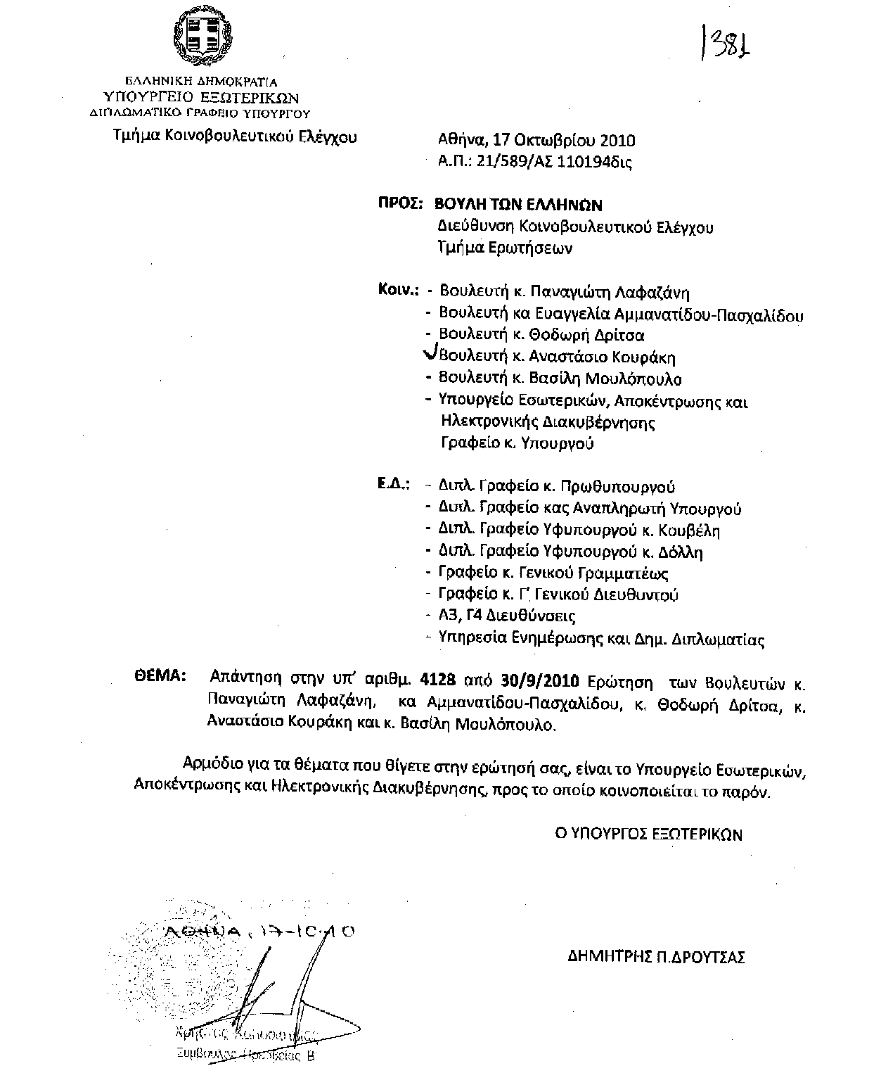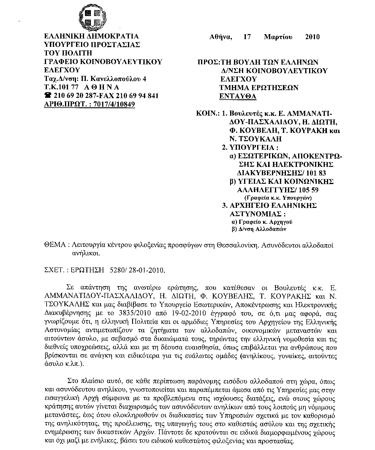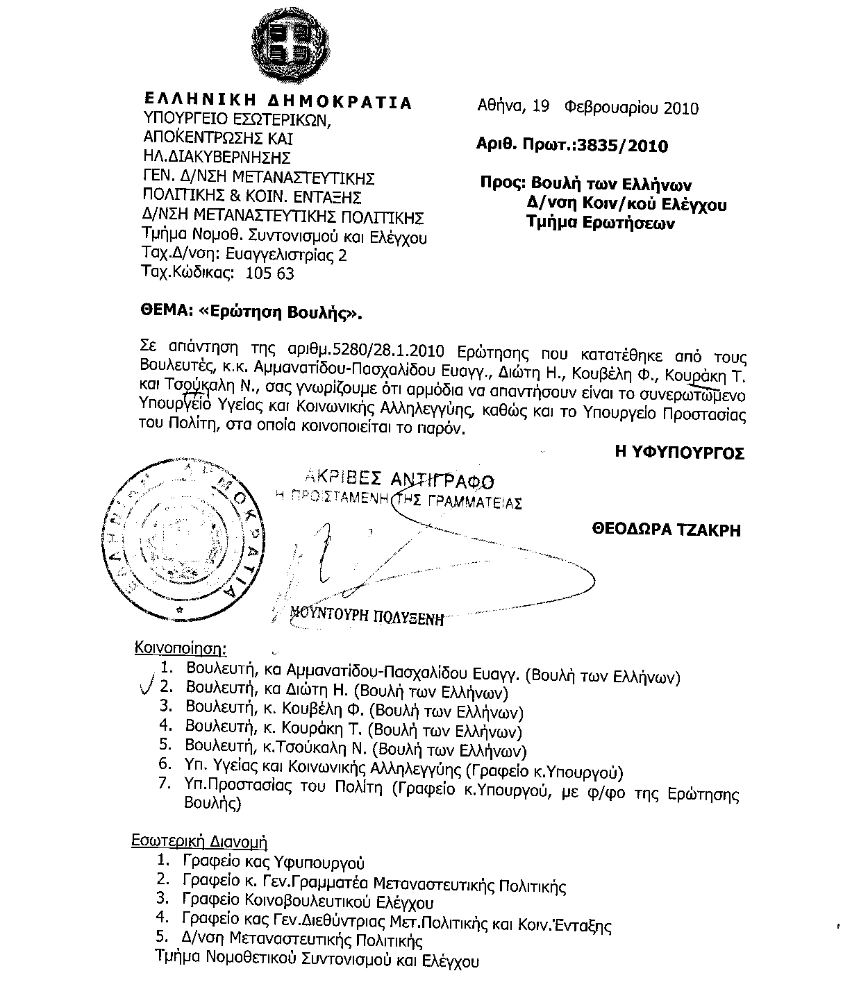 τους κ.κ. Υπουργούς Εθνικής Άμυνας, Εσωτερικών, Αποκέντρωσης και Ηλεκτρονικής Διακυβέρνησης, Προστασίας του Πολίτη και την κ.Υπουργό Υγείας και Κοινωνικής Αλληλεγγύης