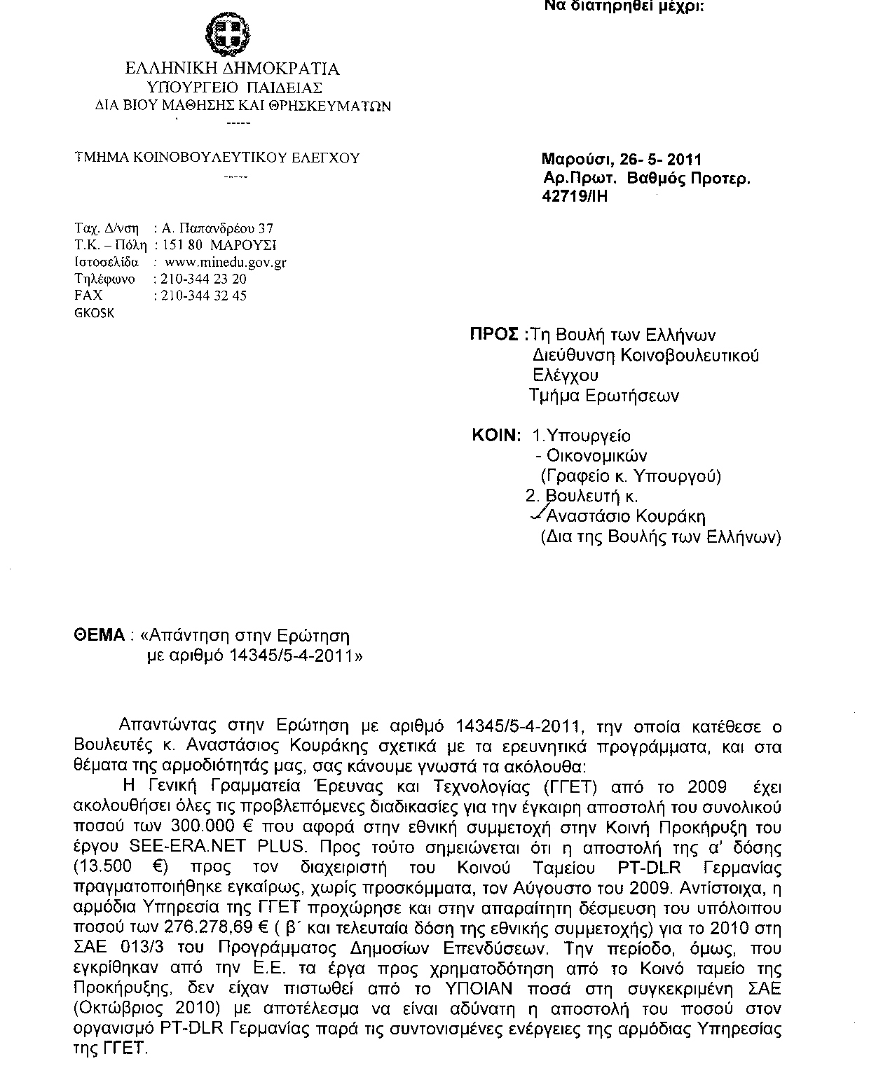 Στην ερώτηση του κ. Κουράκη θα απαντήσει η Υπουργός κυρία Διαμαντοπούλου, αφού πρώτα ο κ. Κουράκης μας παρουσιάσει την ερώτησή του.