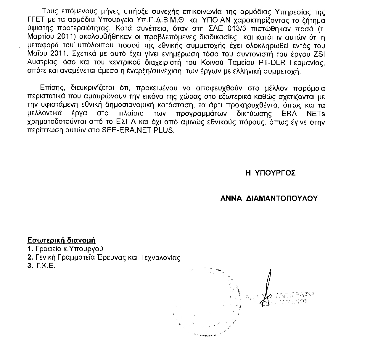 Επιπλέον θα έλεγα ότι πέρα από το ΕΛΚΕΘΕ, που έχει απλήρωτο προσωπικό, το ερευνητικό κέντρο ΑΘΗΝΑ, το ερευνητικό προσωπικό του ΙΠΕΤ δεν έχει πληρωθεί καθόλου το 2011, ενώ το προσωπικό του Ινστιτούτου Επεξεργασίας Λόγου έχει απλήρωτους μισθούς από το 2010. Καταλαβαίνετε ότι χρειάζεται μία απάντηση για αυτό και μία υπόσχεση για την ταχύτερη πληρωμή των ερευνητών που εργάζονται στα κέντρα αυτά.