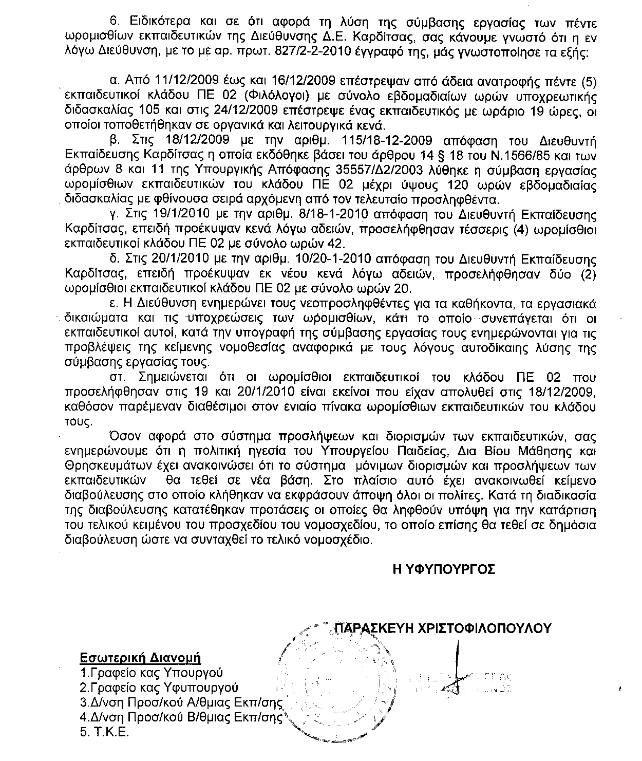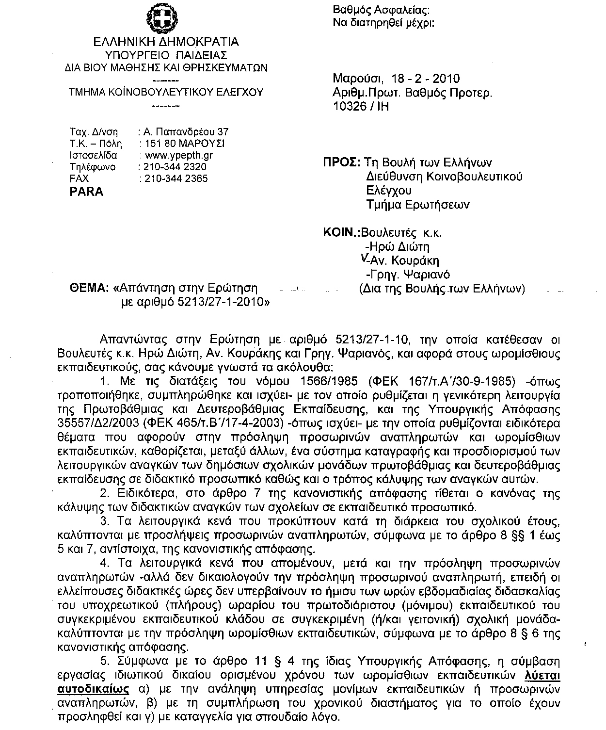 την κ. Υπουργό Παιδείας δια Βίου Μάθησης & Θρησκευμάτων