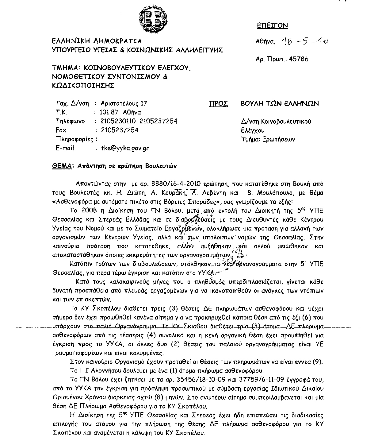 Στην επίκαιρη ερώτηση του κ. Κουράκη θα απαντήσει η Υπουργός Υγείας και Κοινωνικής Αλληλεγγύης κ. Μαριλίζα Ξενογιαννακοπούλου, για τρία λεπτά.