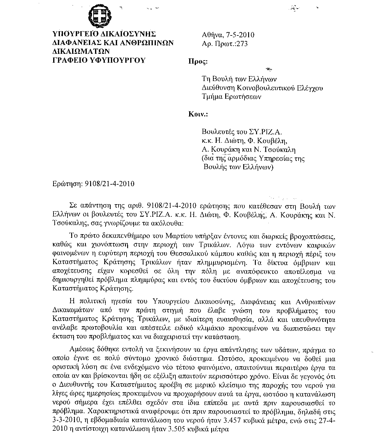Ακολουθεί η με αριθμό 340/25-01-2010 Επίκαιρη Ερώτηση του Βουλευτή του Συνασπισμού Ριζοσπαστικής Αριστεράς κ. Αναστασίου Κουράκη προς τον Υπουργό Δικαιοσύνης, Διαφάνειας και Ανθρωπίνων Δικαιωμάτων, σχετικά με την αντιμετώπιση των προβλημάτων των φυλακών Γρεβενών.