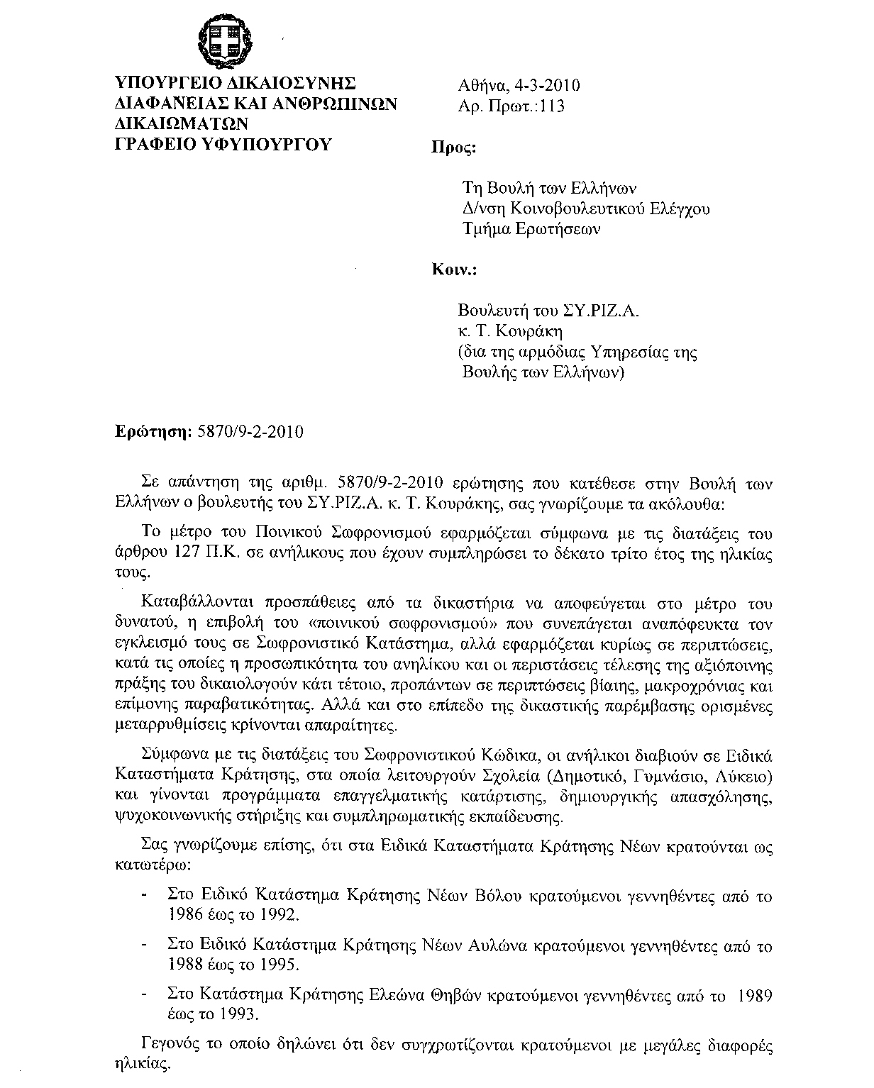 Στην ερώτηση του κ. Κουράκη θα απαντήσει ο Υπουργός Δικαιοσύνης, Διαφάνειας και Ανθρωπίνων Δικαιωμάτων, κ. Καστανίδης.