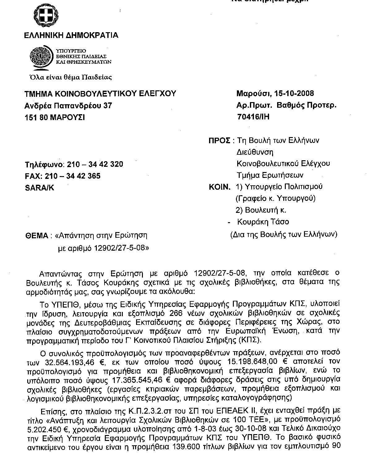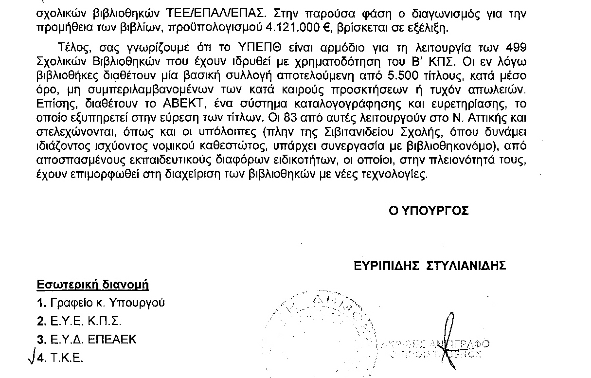 Παρά το πλήθος των βαρύγδουπων προεκλογικών δεσμεύσεων και εξαγγελιών από Υπουργούς και Πρωθυπουργούς την τελευταία δεκαετία, παραμένουν ελάχιστες οι σχολικές βιβλιοθήκες. Μόνο 499 σχολεία της δευτεροβάθμιας εκπαίδευσης και κανένα δημοτικό σχολείο από ένα σύνολο 9.780 σχολείων πρωτοβάθμιας και δευτεροβάθμιας εκπαίδευσης, δηλαδή περίπου το 5% των δημόσιων σχολείων διαθέτουν βιβλιοθήκη. Αρχικά, το 2.000, το κράτος εξήγγειλε το ποσό των 70.431.000 ευρώ που θα διέθετε μέσω των Περιφερειακών Επιχειρησιακών Προγραμμάτων για τη δημιουργία 1.000 νέων σχολικών βιβλιοθηκών.