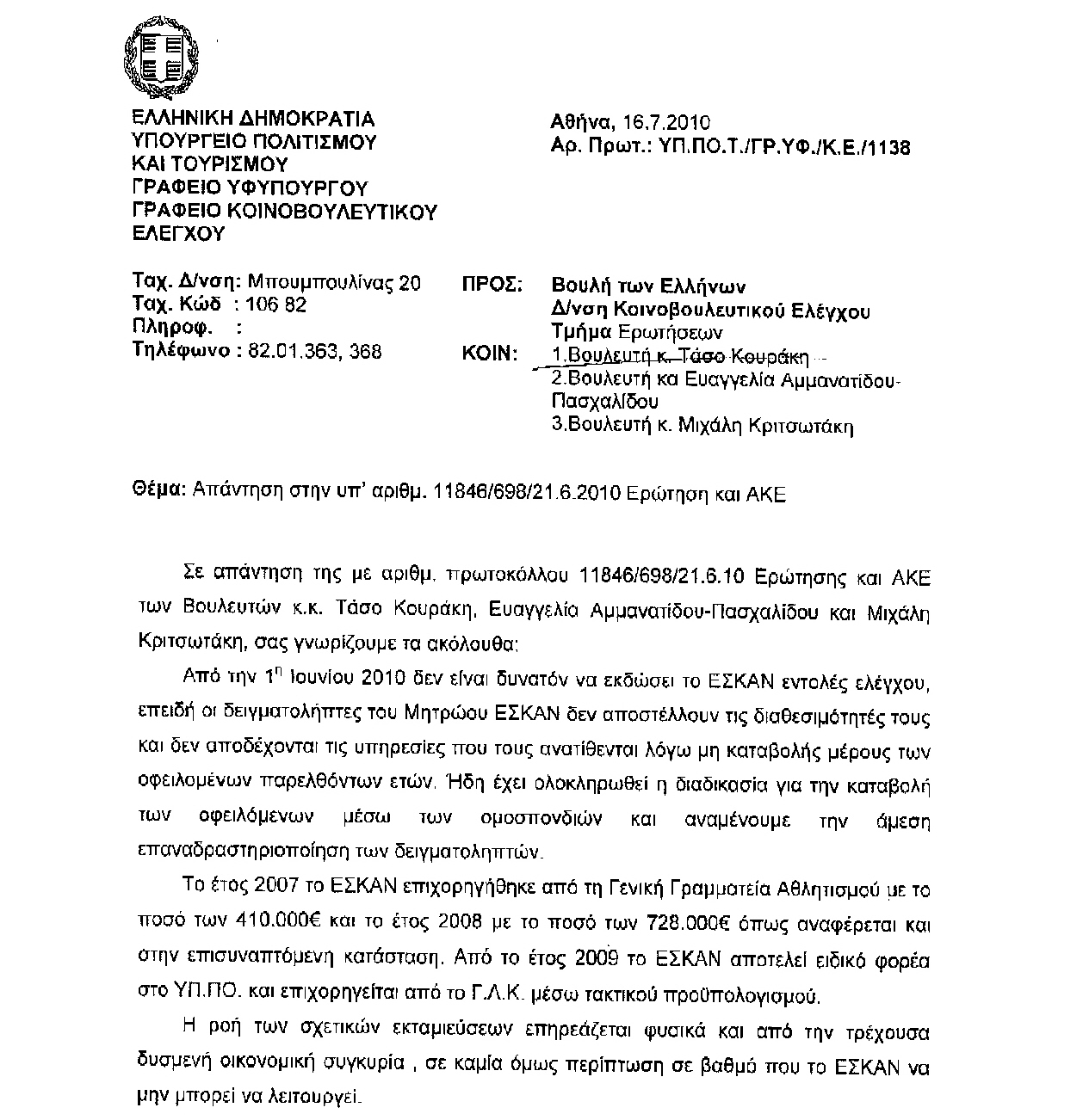 Πρόσφατα δημοσιεύματα του ελληνικού τύπου αποκαλύπτουν, αφενός μεν τη πραγματική διάσταση της σιωπηρής τιμωρίας – συμβιβασμού μεταξύ της Παγκόσμιας Ομοσπονδίας Στίβου (IAAF) με τους αθλητές Κ. Κεντέρη και Κ. Θάνου, αφετέρου δε επαναφέρουν το θέμα της ελληνικής «εμπλοκής» στην έκνομη δραστηριότητα της εταιρείας BALCO στις ΗΠΑ (διακίνηση ντόπινγκ), για την οποία έχουν επιβληθεί και ποινικές κυρώσεις. Ερωτώνται οι κ.κ.