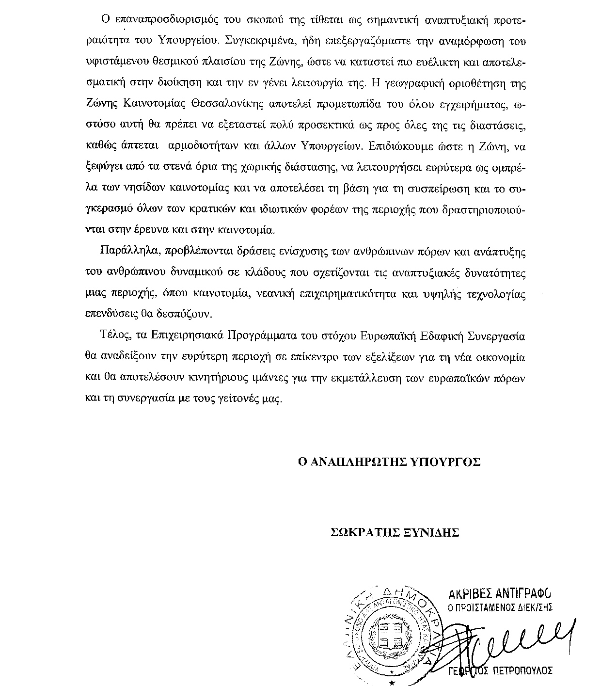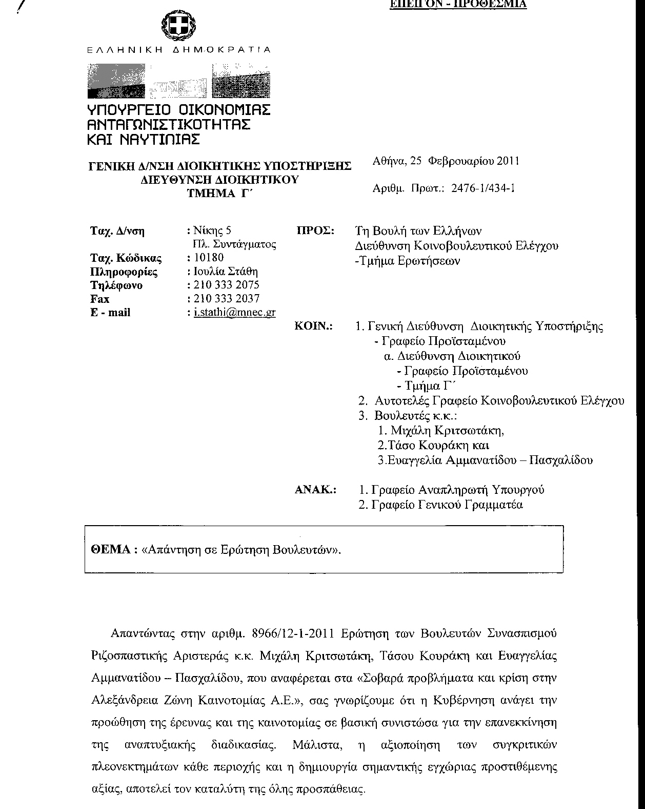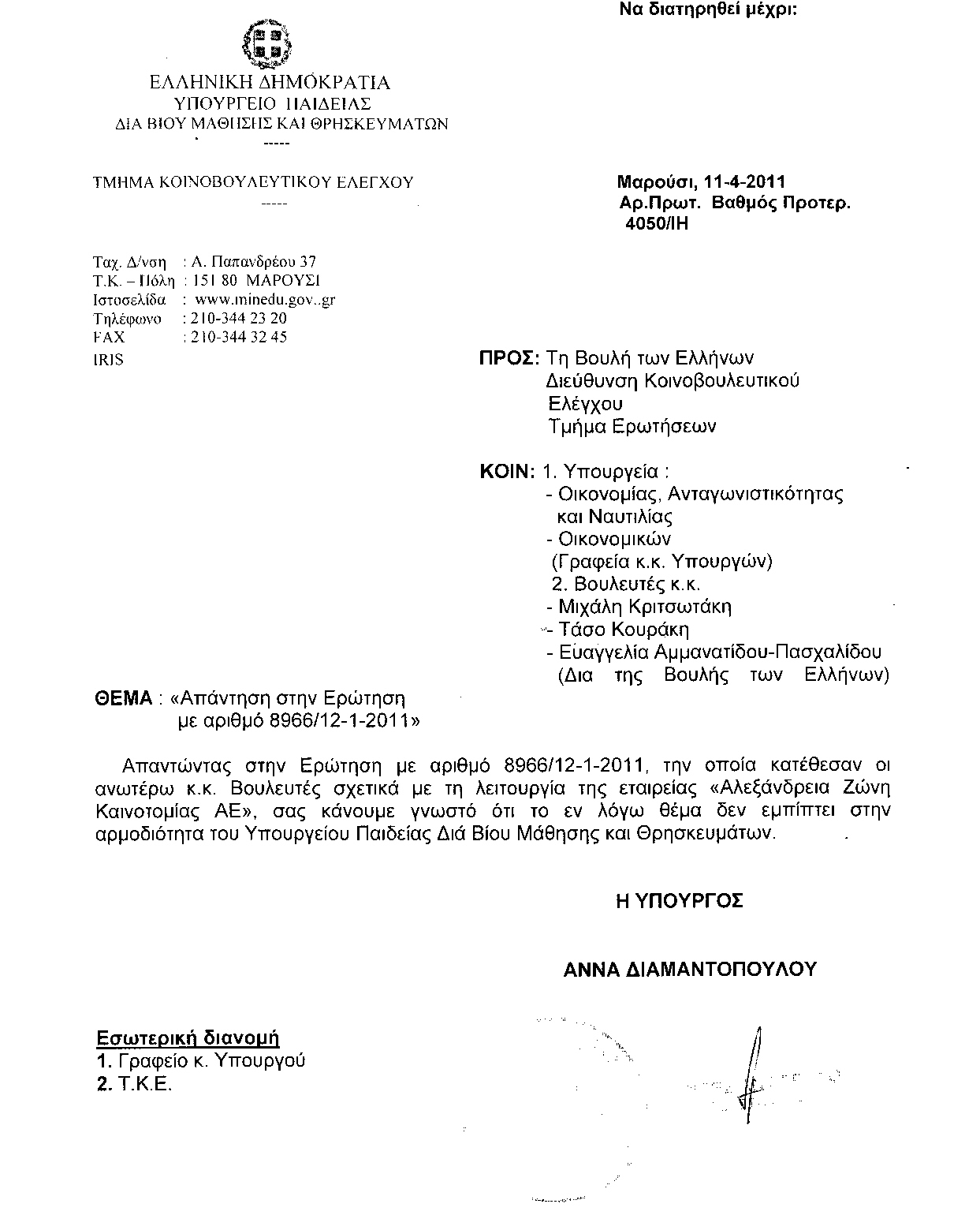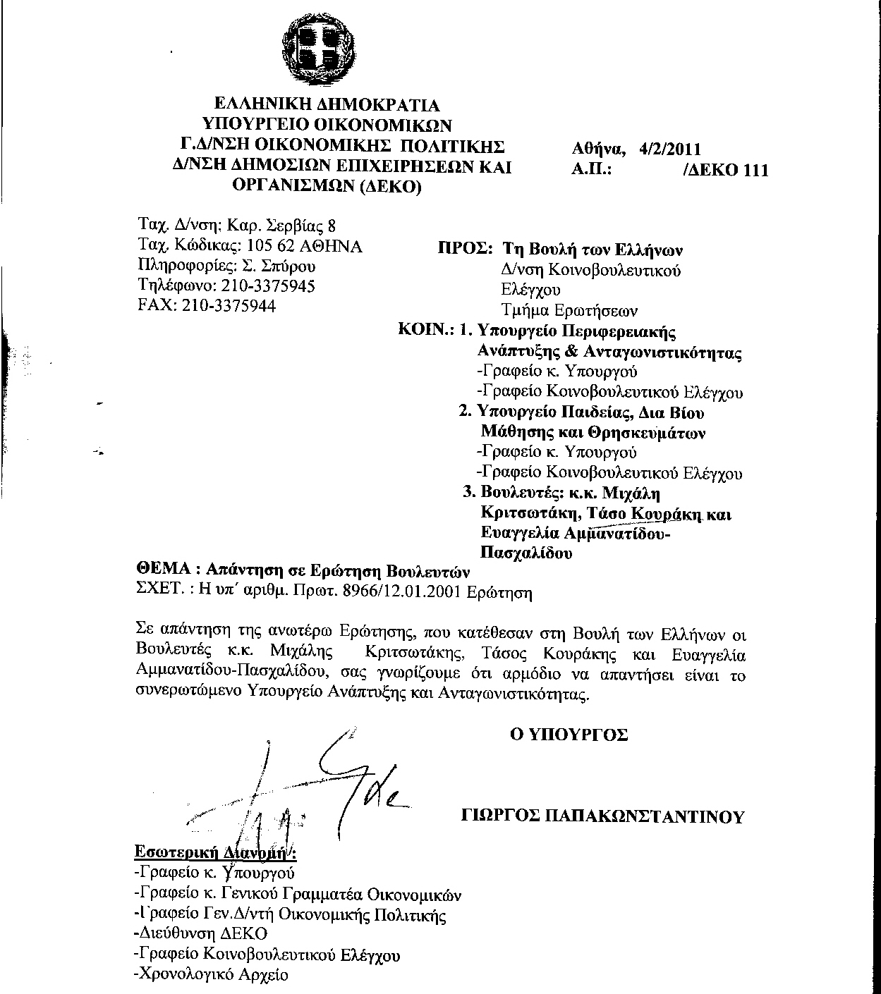 τους κ.κ. Υπουργούς - Περιφερειακής Ανάπτυξης και Ανταγωνιστικότητας - Οικονομικών και - Παιδείας, Δια Βίου Μάθησης και Θρησκευμάτων