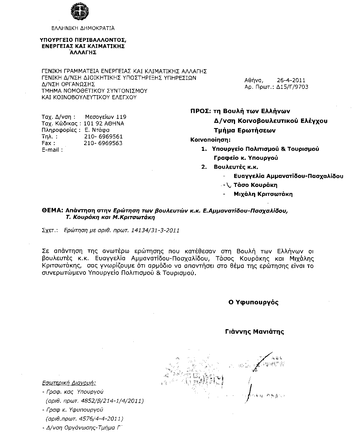 τους κκ. Υπουργούς: • Πολιτισμού και Τουρισμού • Περιβάλλοντος, Ενέργειας και Κλιματικής Αλλαγής