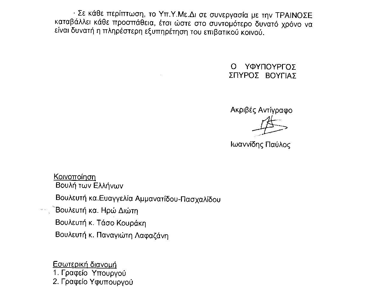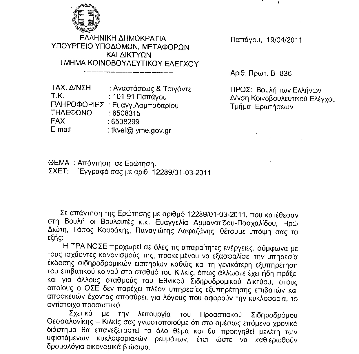 τον κ. Υπουργό Μεταφορών, Υποδομών και Δικτύων