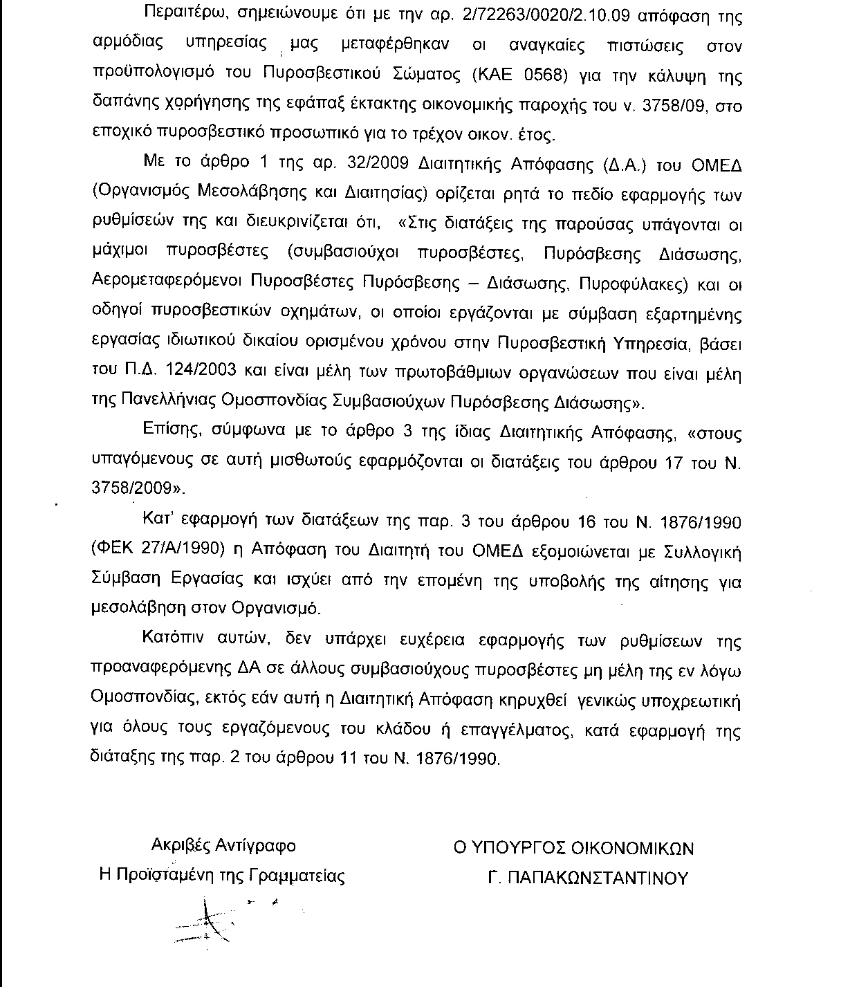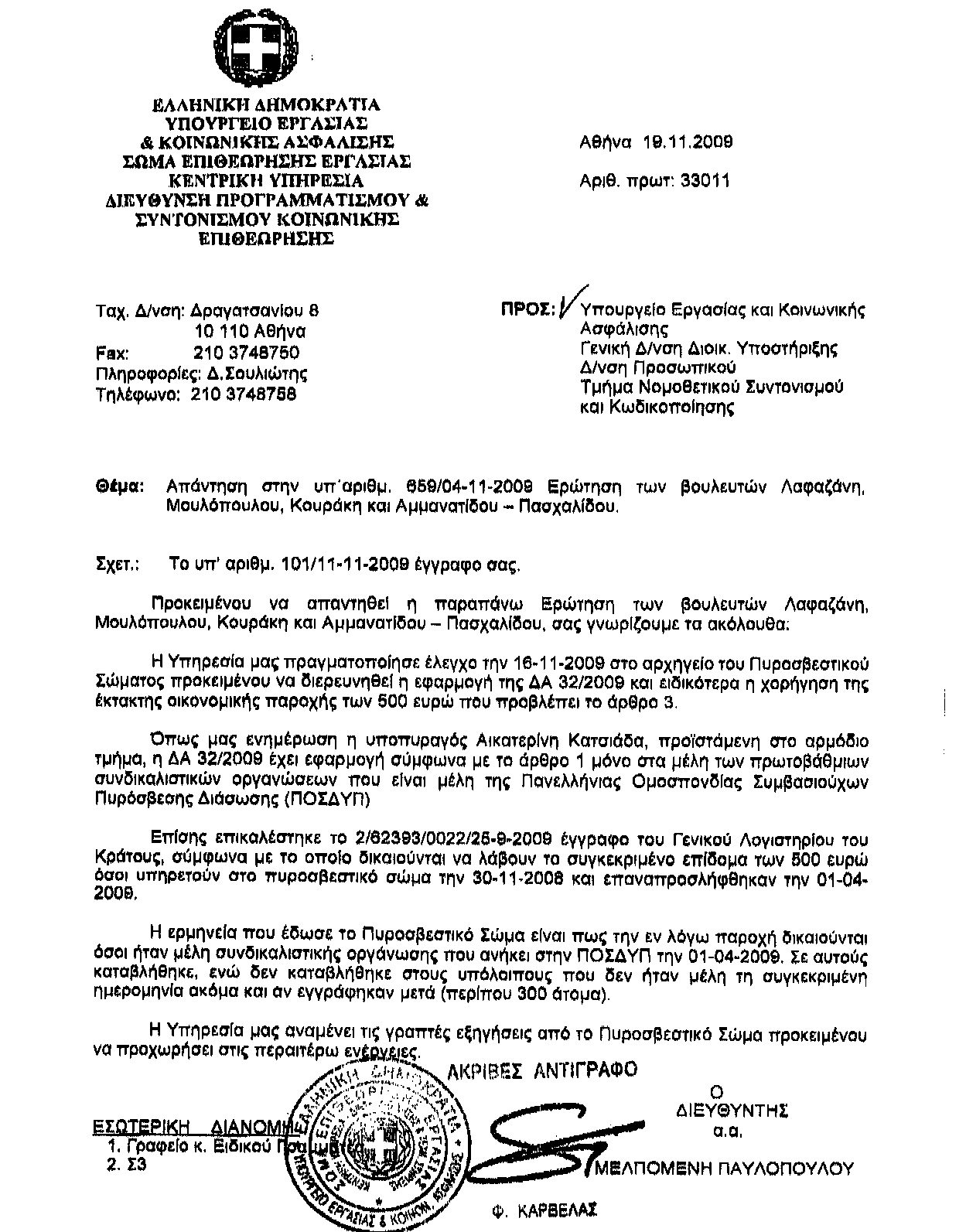 διατάξεις που προσαυξάνουν τα μόρια και τις πιθανότητες ένταξής τους και πρόσληψής τους σε μία μόνιμη δουλειά. Υπάρχει δηλαδή το στοιχείο της προσαύξησης των μορίων για την πρόσληψή τους, χωρίς να αποκλείεται να διεκδικούν και το υπόλοιπο 70% των θέσεων και τα οποία και πολλαπλασιάζονται όταν είναι εθελοντές συνδυάζοντας και τις δύο ιδιότητες. Τέλος για το εφάπαξ επίδομα πρέπει να σας πω πως χορηγήθηκε σχεδόν σε όλους, στη συντριπτική πλειοψηφία, σε τέσσερις χιλιάδες οκτακόσιους πενήντα οκτώ δικαιούχους σε όλη την επικράτεια, μέλη πρωτοβάθμιων συνδικαλιστικών οργανώσεων σύμφωνα με τους καταλόγους που έδωσε στο Γενικό Λογιστήριο του Κράτους η Πανελλήνια Ομοσπονδία των Εποχικών Πυροσβεστών. Η απόφαση προέβλεπε ορισμένες κατηγορίες μισθοδοσίας. Ξέρω πως εξαιρέθηκαν λίγοι, συνάδελφοι.