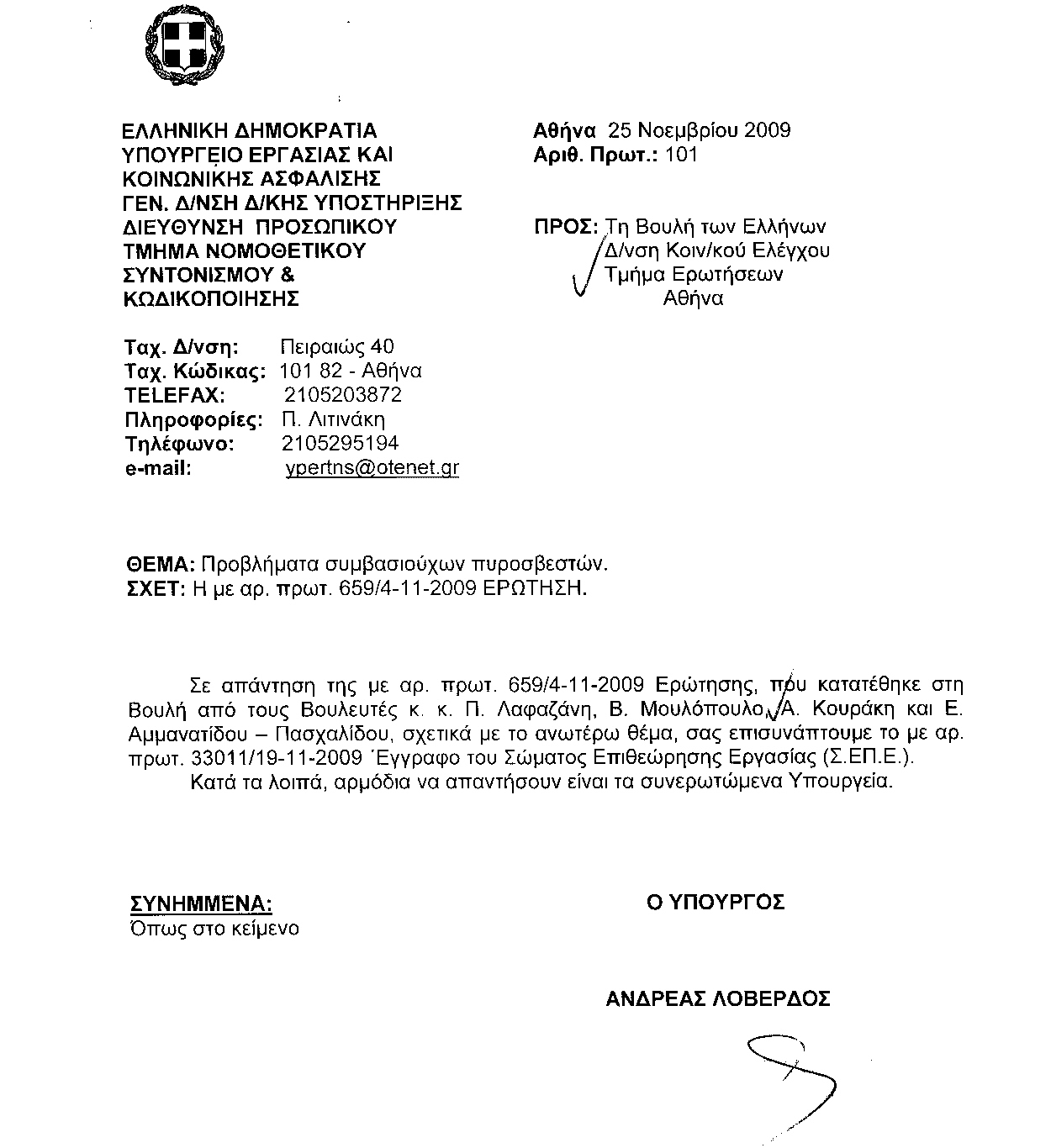 Τελειώνω την πρωτομιλία μου λέγοντας πως τιμούμε τον ηρωισμό αυτών των ανθρώπων που μαζί με τους μόνιμους πυροσβέστες έδωσαν τους αγώνες τους. Από αυτά τα παιδιά, εννιά θυσιάστηκαν μόνο το 2007 και είκοσι περίπου έχασαν τη ζωή τους την τελευταία δεκαετία, προσπαθώντας να σβήσουν τις πυρκαγιές στη χώρα μας. Θα απαντήσω στα συγκεκριμένα ερωτήματα σχετικά με το εφάπαξ επίδομα και την τριετία της σύμβασης στη δευτερολογία μου.