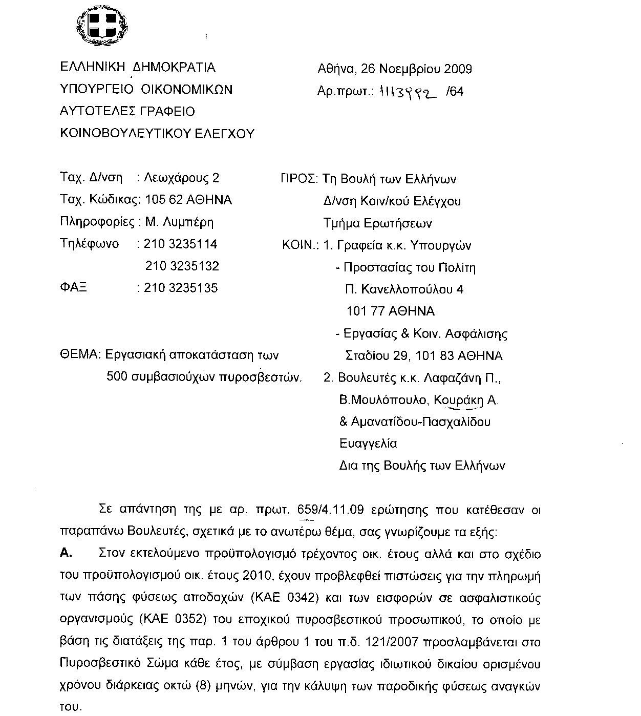 κκ. Υπουργούς •Παιδείας, Δια Βίου Μάθησης & Θρησκευμάτων • Οικονομικών