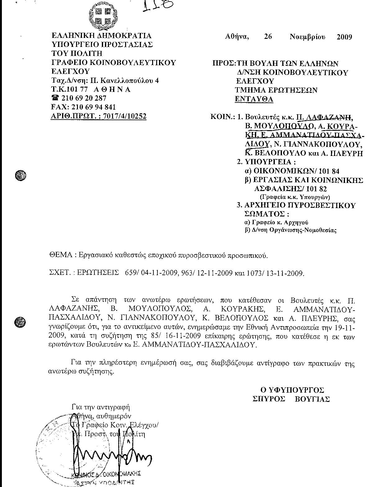 ΣΠΥΡΙΔΩΝ ΒΟΥΓΙΑΣ (Υφυπουργός Προστασίας του Πολίτη):Εξαιρέθηκαν διακόσιοι πενήντα στους πέντε χιλιάδες, σύμφωνα με το Γενικό Λογιστήριο του Κράτους. Εμείς θα έλθουμε σε επαφή με το Γενικό Λογιστήριο του Κράτους, υπάρχει ένα τυπικό κώλυμα, αλλά θα έλθουμε σε  επαφή μαζί του για να δούμε εάν μπορούμε να ξεπεράσουμε τους τυπικούς λόγους για να πάρουν και οι άνθρωποι αυτοί τα χρήματά τους. Σας ευχαριστώ.