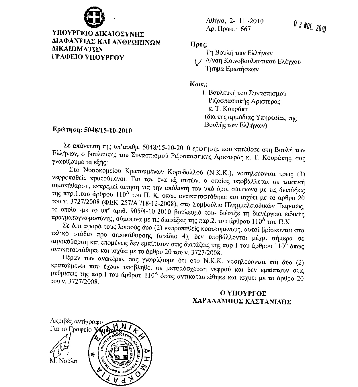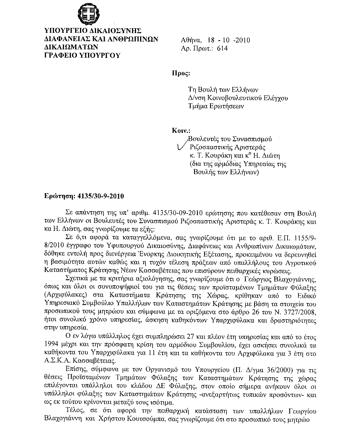 Από εκεί και πέρα, το γεγονός ότι υπήρξε ενασχόληση και ενόχληση των κατοίκων της περιοχής προκάλεσε την αντίδραση από την πλευρά της Νέας Δημοκρατίας και ο συνάδελφος κ. Καράογλου, στις 8-6-2010, υπέβαλε ερώτηση εγκαλώντας την Αστυνομία γιατί δεν διασφαλίζει την ομαλή λειτουργία της επιχείρησης. Σήμερα εσείς με την ερώτησή σας, εγκαλείτε το Υπουργείο Προστασίας του Πολίτη, γιατί λέτε ότι παρέχουμε συνδρομή σε εργοδότες που παρανομούν. Εγώ θέλω να ξεκαθαρίσω από τη δική μας πλευρά τις πολιτικές μας θέσεις.