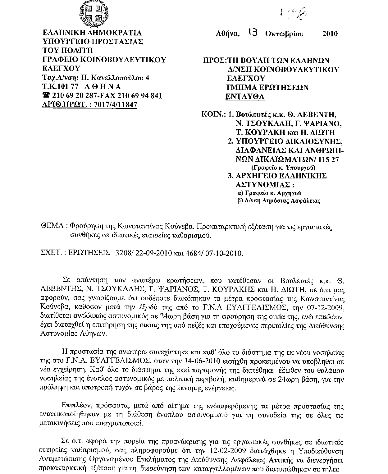 Θέλω να πω δηλαδή ότι η ΕΛ.ΑΣ. –στις υπηρεσίες της οποίας προΐσταστε- δείχνει έναν υπερβολικό ζήλο και προφανώς υποθέτω ότι δεν θα φθάσετε στο σημείο να ισορροπήσετε ανάμεσα στην τοποθέτηση της Νέας Δημοκρατίας και στη δική μας. Ξέρω ότι ο ρόλος σας δεν είναι να είστε ισορροπιστής. Εσείς ουσιαστικά είπατε ότι οφείλει να προστατεύει τα δικαιώματα των πολιτών. Ναι, θα προστατεύει όμως και το δικαίωμα της διαμαρτυρίας, το απολύτως νόμιμο δικαίωμα, ώστε αυτοί οι άνθρωποι να διεκδικούν τα δικαιώματά τους. Πρέπει να σας πω ότι και το Εργατικό Κέντρο έβγαλε ανακοίνωση στην ίδια κατεύθυνση με την οποία ζητά όλη αυτή η επιχείρηση κατατρομοκράτησης των εργαζομένων να σταματήσει. Πολύ φοβούμεθα ότι το επόμενο διάστημα θα έχουμε μία έξαρση αυτής της κατάστασης.