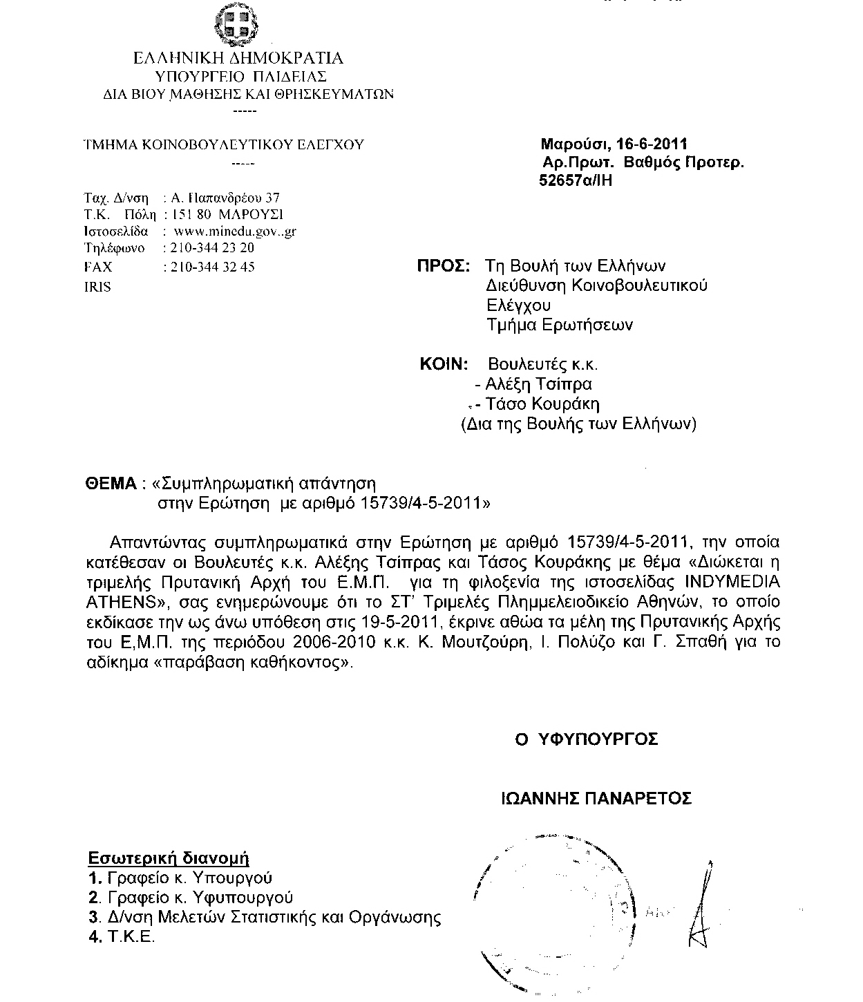 «Η συμμετοχή των πολιτών στις πλατείες, στις γενικές απεργίες, στις παρελάσεις έφεραν την πτώση της κυβέρνησης Παπανδρέου.