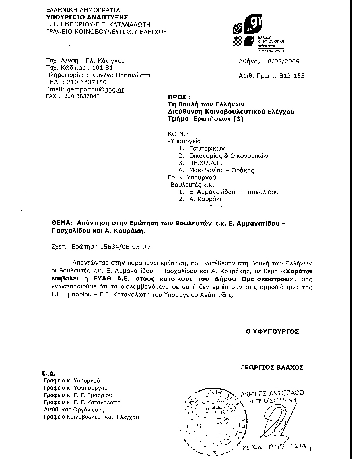 κ.κ. Υπουργούς: Περιβάλλοντος Χωροταξίας και Δημοσίων Έργων Αγροτικής Ανάπτυξης και Τροφίμων