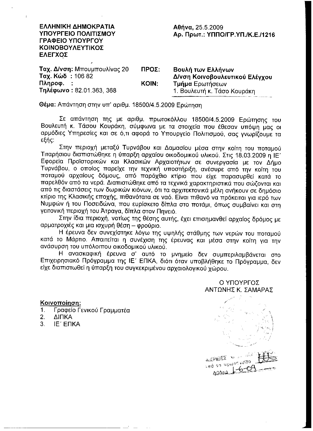 Στη συζήτηση για το νομοσχέδιο για την προστασία των πολιτιστικών αγαθών, που ξεκίνησε σήμερα στην επιτροπή μορφωτικών υποθέσεων της Βουλής, ο βουλευτής του Συνασπισμού Ριζοσπαστικής Αριστεράς Τάσος Κουράκης επισήμανε: «Μετά την εκτεταμένη αρχαιοκαπηλία της Σχοινούσας, τον Απρίλιος του 2006, το ΥΠΠΟ ορθώς έπραξε να συνειδητοποιήσει τις ευθύνες του και να προσπαθήσει να αντιμετωπίσει επιτέλους το πρόβλημα. Όμως, η αρχαιοκαπηλία είναι άμεσα συνδεδεμένη με την ελλιπή φύλαξη των αρχαιοτήτων, των αρχαιολογικών τόπων και των ανασκαφών.