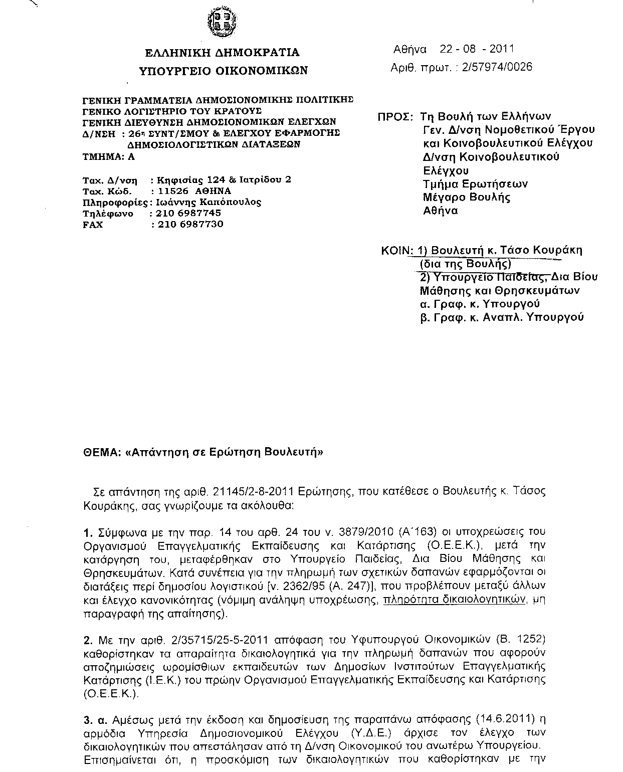 Από εκεί και πέρα, το Υπουργείο Οικονομικών για να μπορέσει να προχωρήσει στην εξόφληση όρισε κάποιες προϋποθέσεις. Εξέδωσε μια υπουργική απόφαση με την οποία καθόρισε τη σχετική διαδικασία. Αυτή είναι μια διαδικασία χρονοβόρα, αλλά είμαστε υποχρεωμένοι να την ακολουθήσουμε. Ακριβώς για να μπορέσουμε να συντομεύσουμε τους χρόνους και να ανταπεξέλθουμε και να ανταποκριθούμε το συντομότερο δυνατό έχουμε δημιουργήσει ομάδες δουλειάς και στον ΕΟΠΠγια να συλλέξουν τα δικαιολογητικά και στην Οικονομική Υπηρεσία του Υπουργείου και ενισχύσαμε και την Υπηρεσία Δημοσιονομικού Ελέγχου του Γενικού Λογιστηρίου, που είναι υποχρεωμένη να κάνει τον τελικό έλεγχο για τα παραστατικά. Έχουν συγκεντρωθεί τα παραστατικά και τα δικαιολογητικά σχεδόν από τα περισσότερα ΙΕΚ αυτή τη στιγμή –είναι λίγα αυτά που απομένουν ακόμη- έχουν προωθηθεί στην Υπηρεσία Δημοσιονομικού Ελέγχου, η οποία πιστεύω ότι για τα πρώτα ΙΕΚ το αμέσως επόμενο διάστημα είναι έτοιμη να προχωρήσει και να δώσει τα στοιχεία στην Ενιαία Αρχή Πληρωμών.