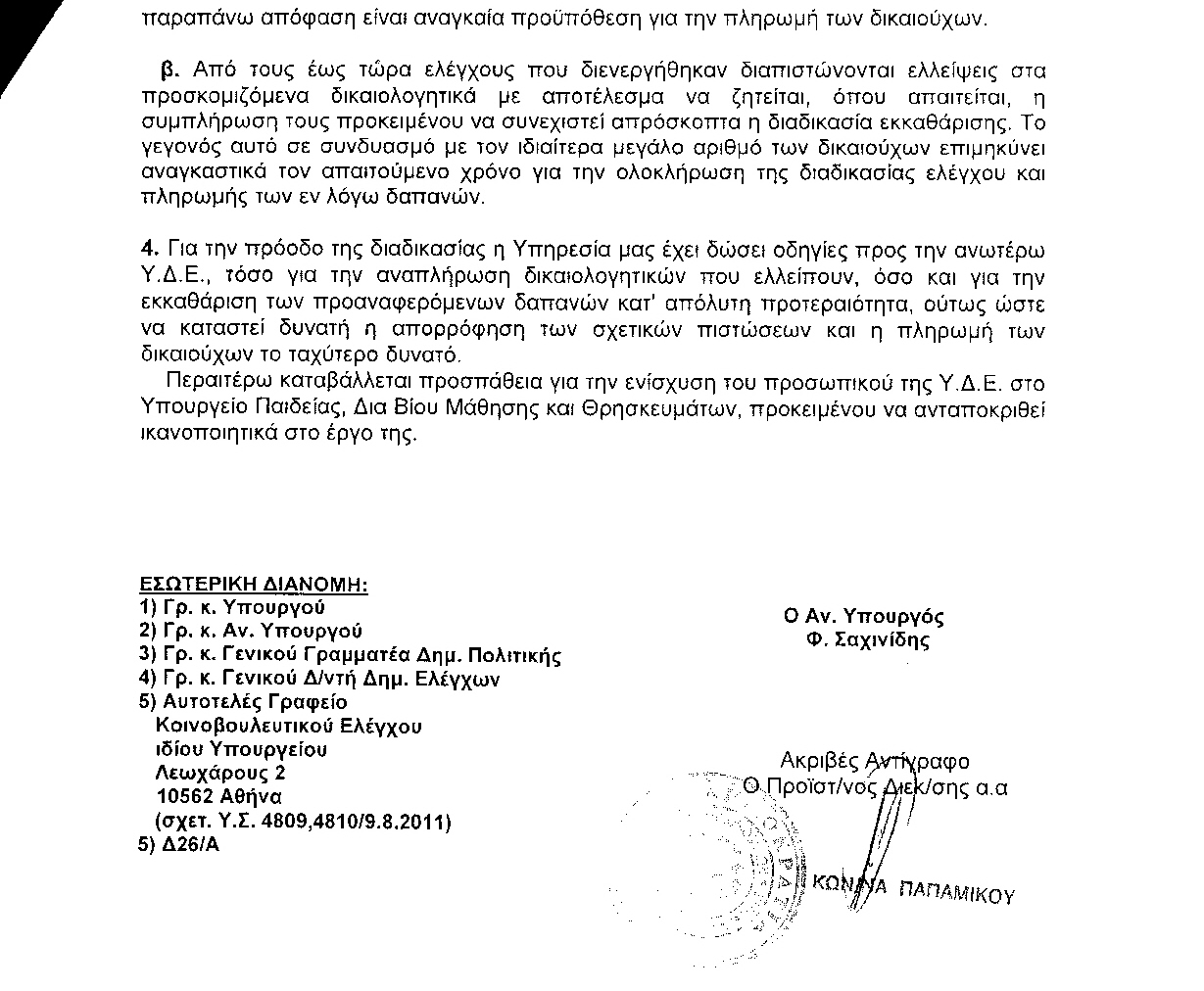 Από τη μεριά μου, είμαι ο τελευταίος άνθρωπος, όσο κι αν πιέζω να γίνουν όσο πιο γρήγορα γίνεται αυτές οι διαδικασίες, που θα πω «Να δώσετε χρήματα χωρίς έλεγχο». Κανέναν υπάλληλο του Υπουργείου Οικονομικών εγώ δεν μπορώ να πιέσω να βάλει την υπογραφή του για όλα αυτά τα εκατομμύρια ευρώ χωρίς να έχει κάνει πρώτα τις διαδικασίες και τους ελέγχους, που η νομιμότητα και το δημόσιο λογιστικό επιβάλλουν και το επιβάλλει και συγκεκριμένη υπουργική απόφαση που εκδόθηκε από το Υπουργείο Οικονομικών.