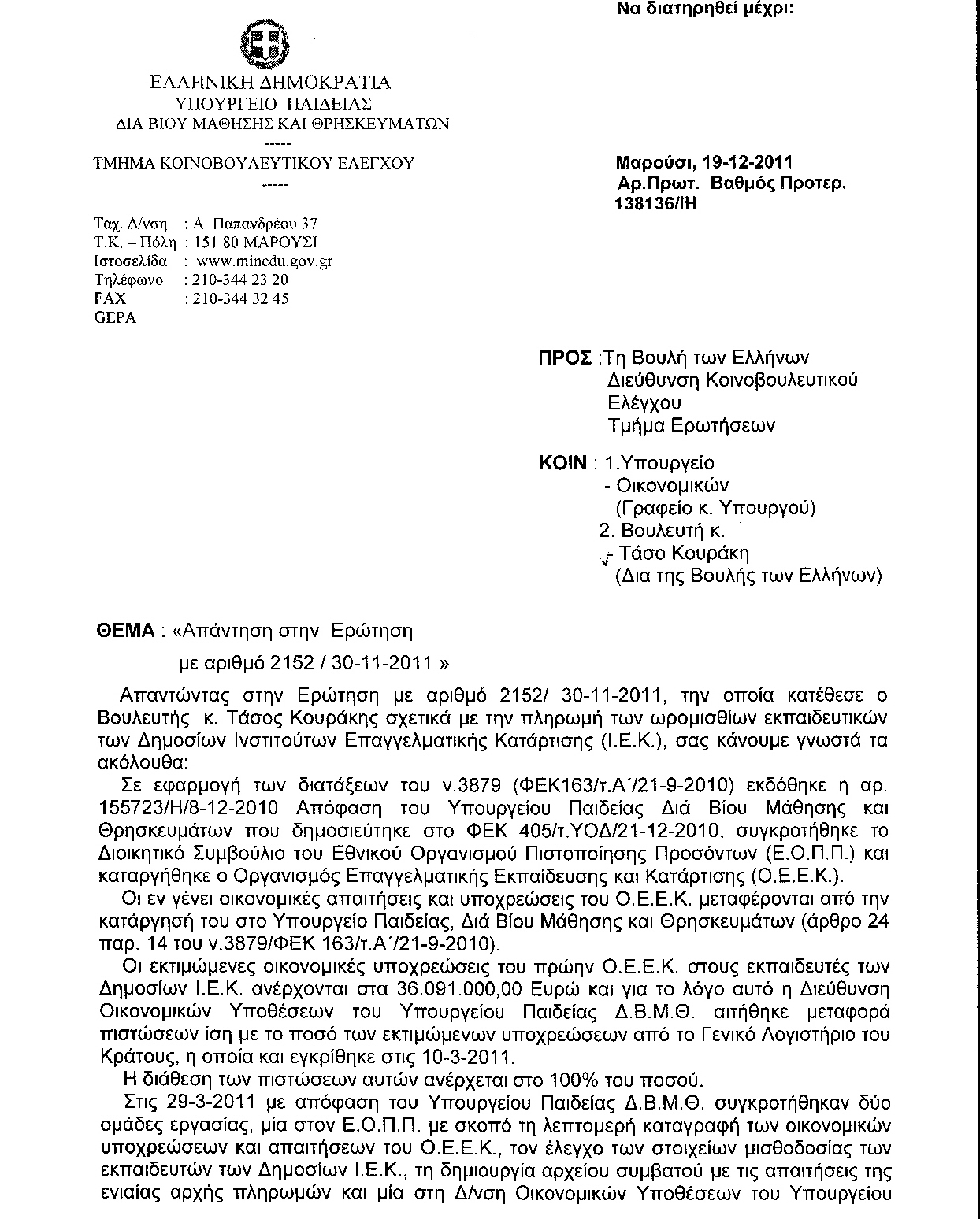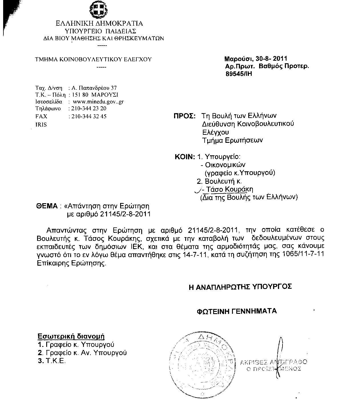 Τώρα θα συζητηθεί η με αριθμό 1065/11-7-2011 επίκαιρη ερώτηση του Βουλευτή του Κομμουνιστικού Κόμματος Ελλάδας κ. Ιωάννη Πρωτούλη προς την Υπουργό Παιδείας, Δια Βίου Μάθησης και Θρησκευμάτων, σχετικά με τη καταβολή των δεδουλευμένων στους καθηγητές των δημοσίων ΙΕΚ.