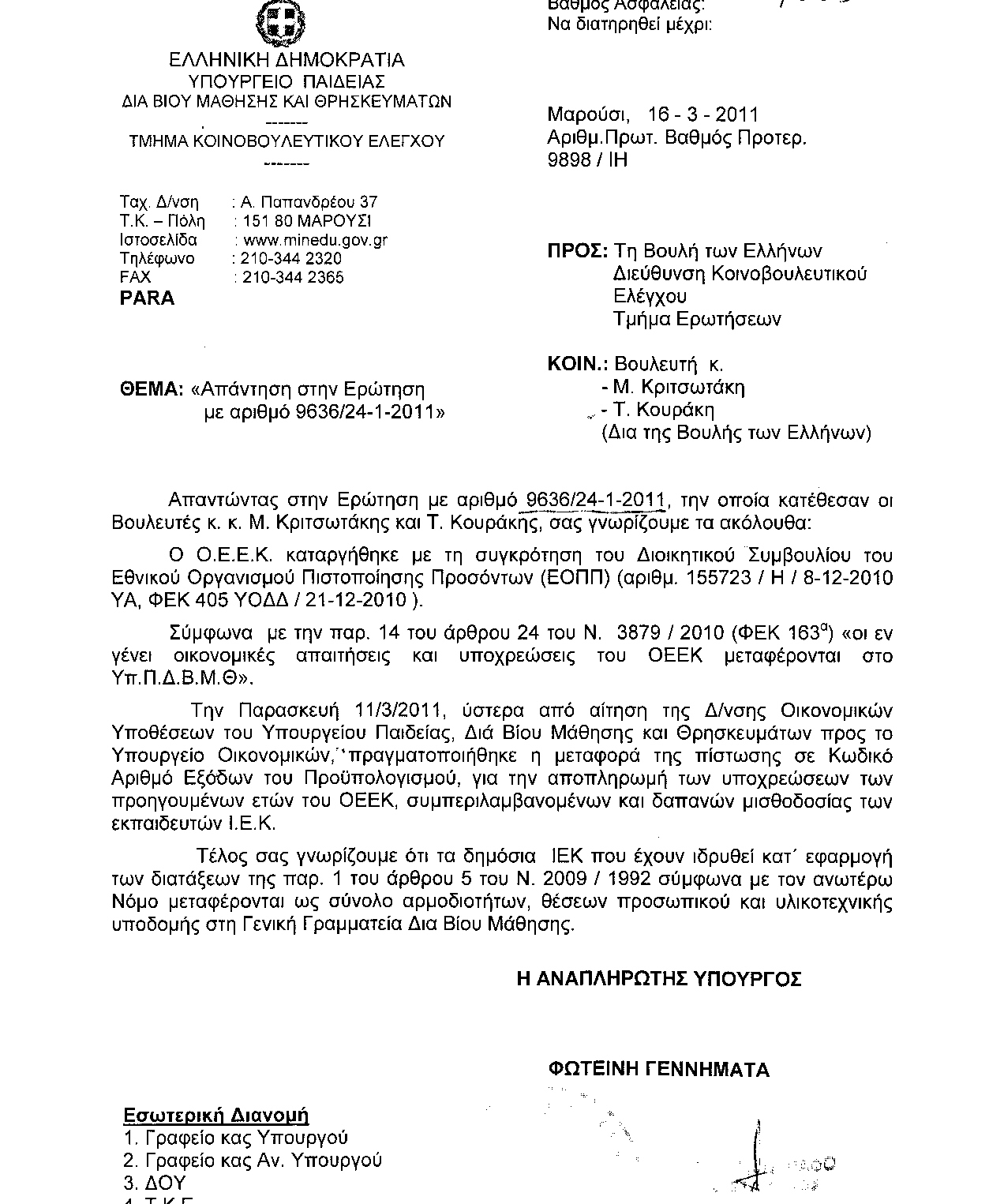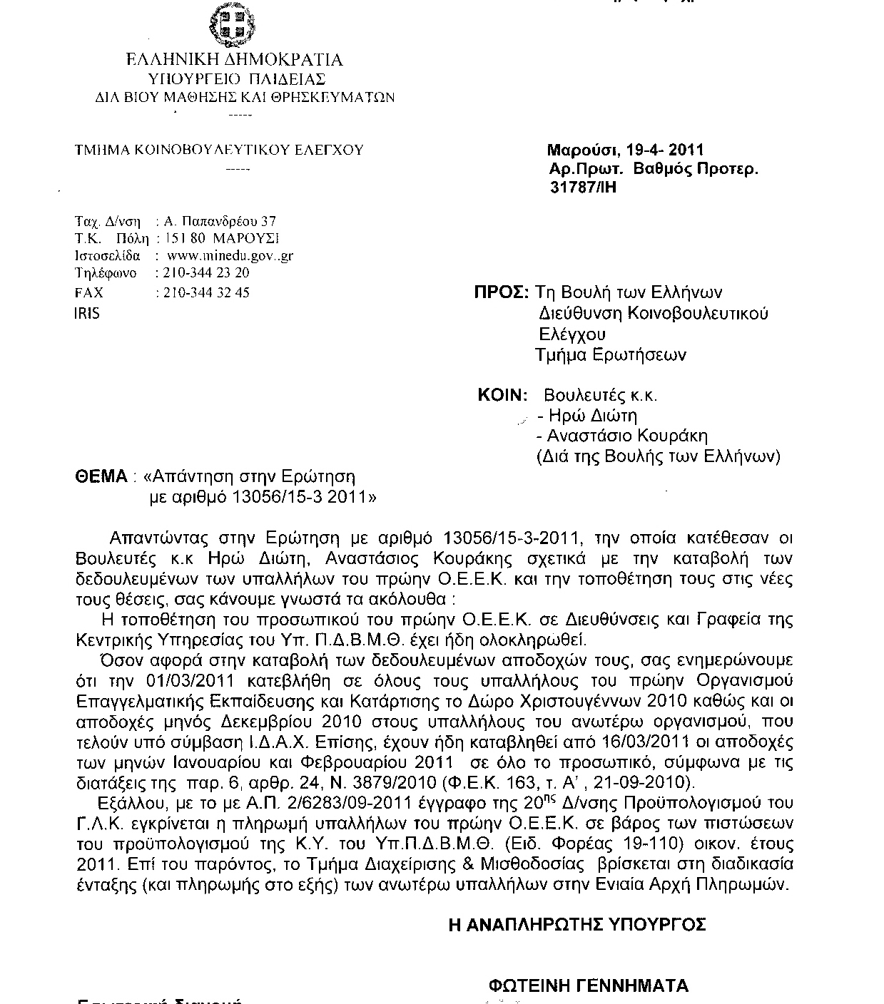 ΦΩΤΕΙΝΗ ΓΕΝΝΗΜΑΤΑ (Αναπληρώτρια Υπουργός Παιδείας, Δια Βίου Μάθησης και Θρησκευμάτων): Θέλω να υπενθυμίσω ότι ακριβώς η αδυναμία του ΟΕΕΚ να αντιμετωπίσει με αποτελεσματικότητα το συσσωρευμένο χρέος ήταν ένας από τους λόγους που με το νόμο 3879 μεταφέρθηκε η υποχρέωση εξόφλησης των οφειλών της περιόδου 2008 έως το τέλος του 2010 στο Υπουργείο Παιδείας, στην κεντρική του υπηρεσία.