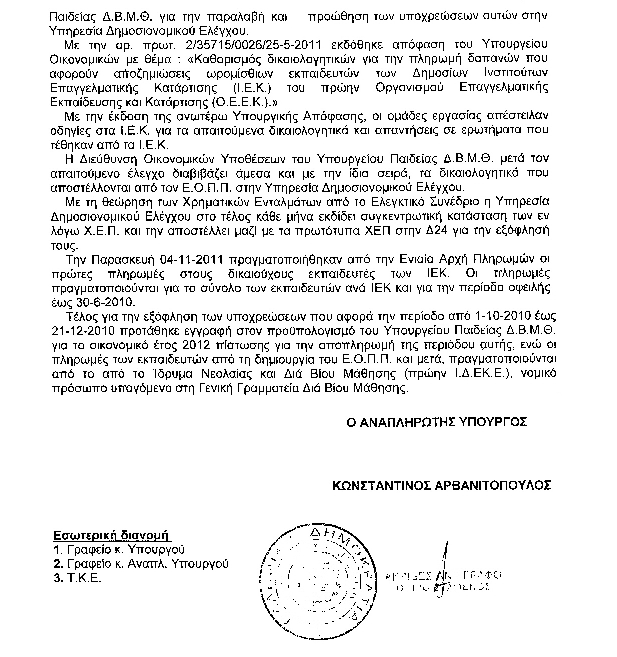 Η Γενική Γραμματεία Διά Βίου Μάθησης αξιοποιώντας το Ινστιτούτο Διαρκούς Εκπαίδευσης Ενηλίκων έχει καταβάλλει τα δεδουλευμένα του Ιανουαρίου και Φεβρουαρίου. Πιστεύω ότι το αμέσως επόμενο διάστημα θα εξοφλήσει τις οφειλές του τρέχοντος εξαμήνου, δίνοντας ένα οριστικό τέλος στην απαράδεκτη δημιουργία και συσσώρευση χρεών, όπως έγινε τα προηγούμενα χρόνια.